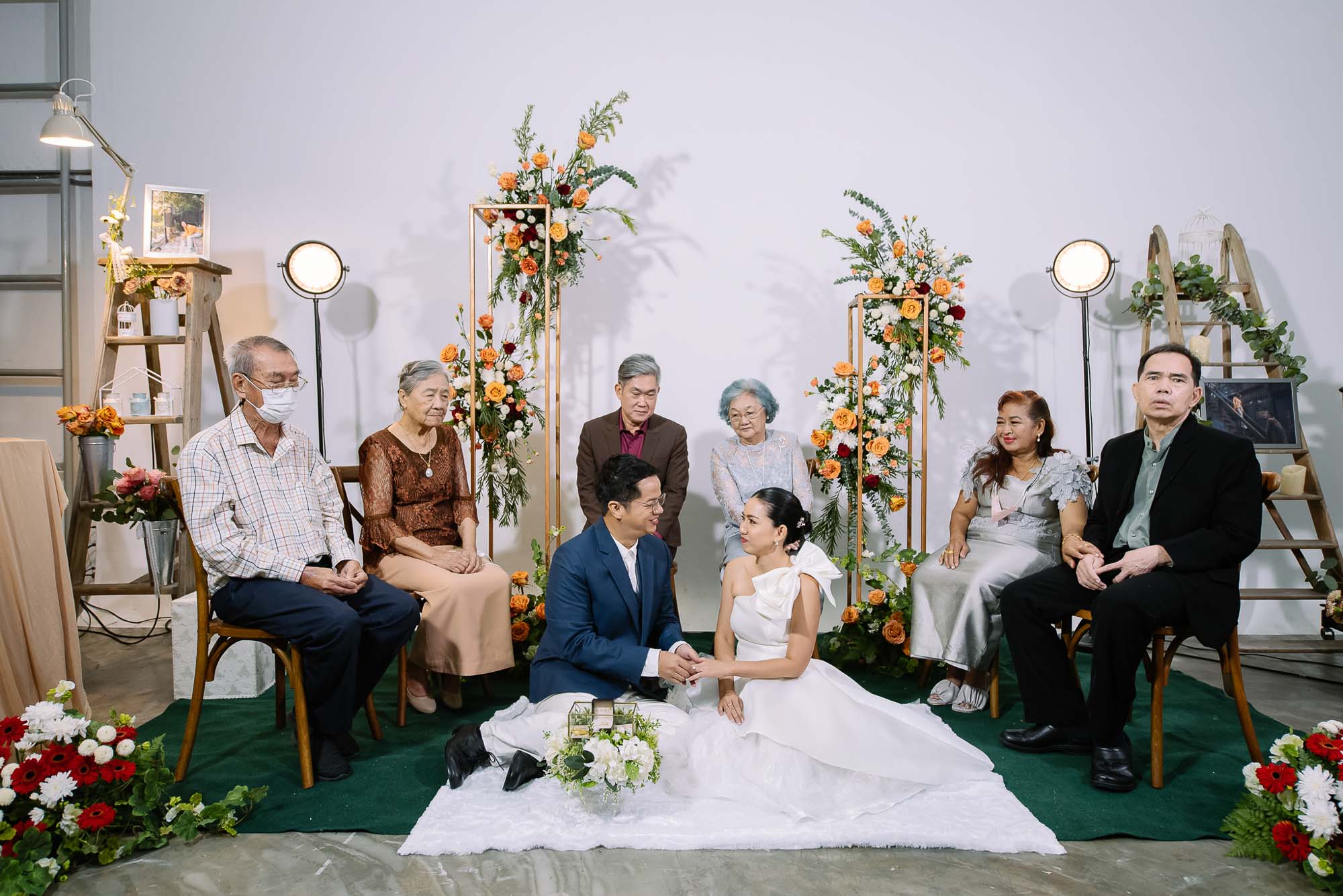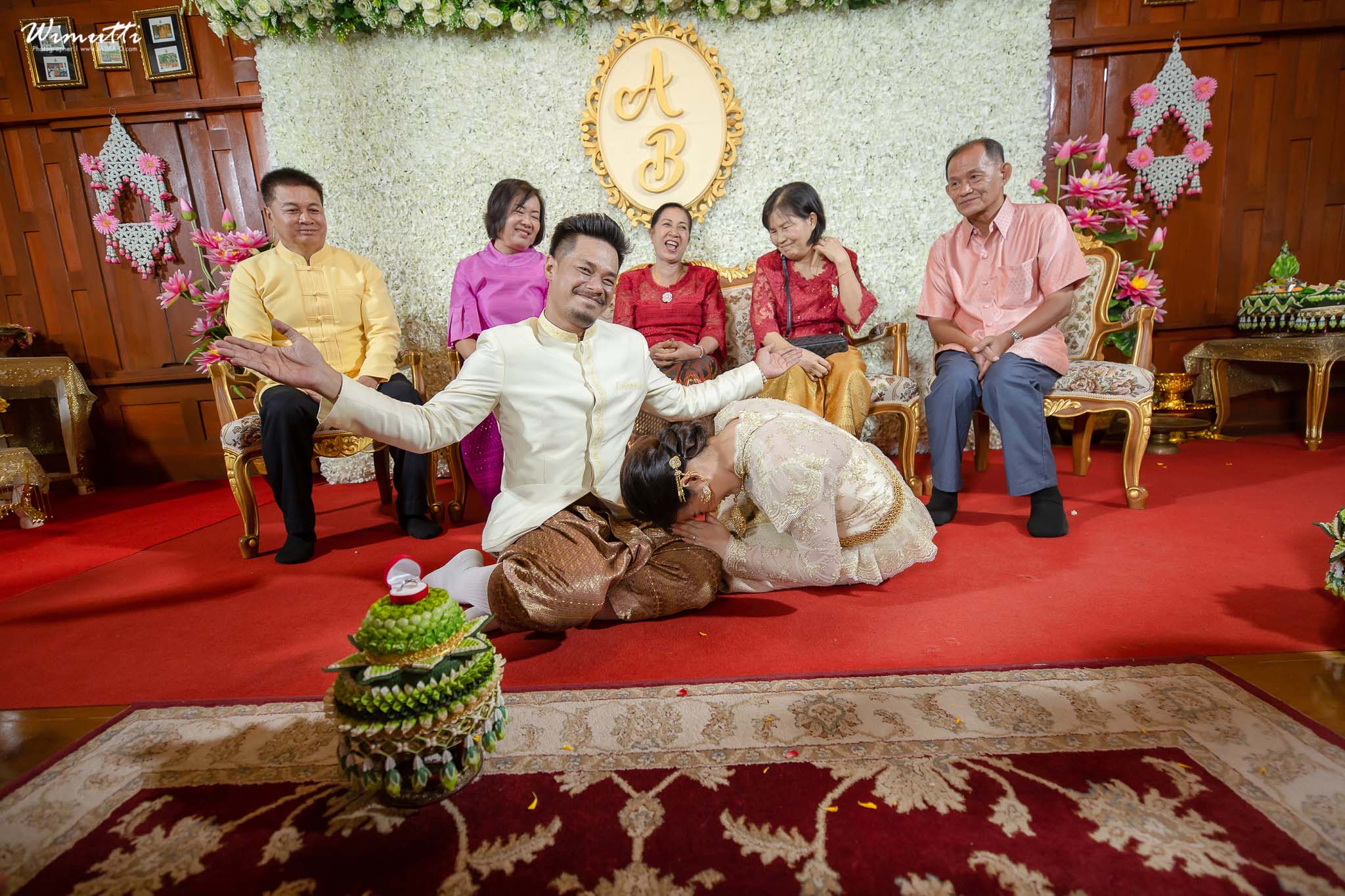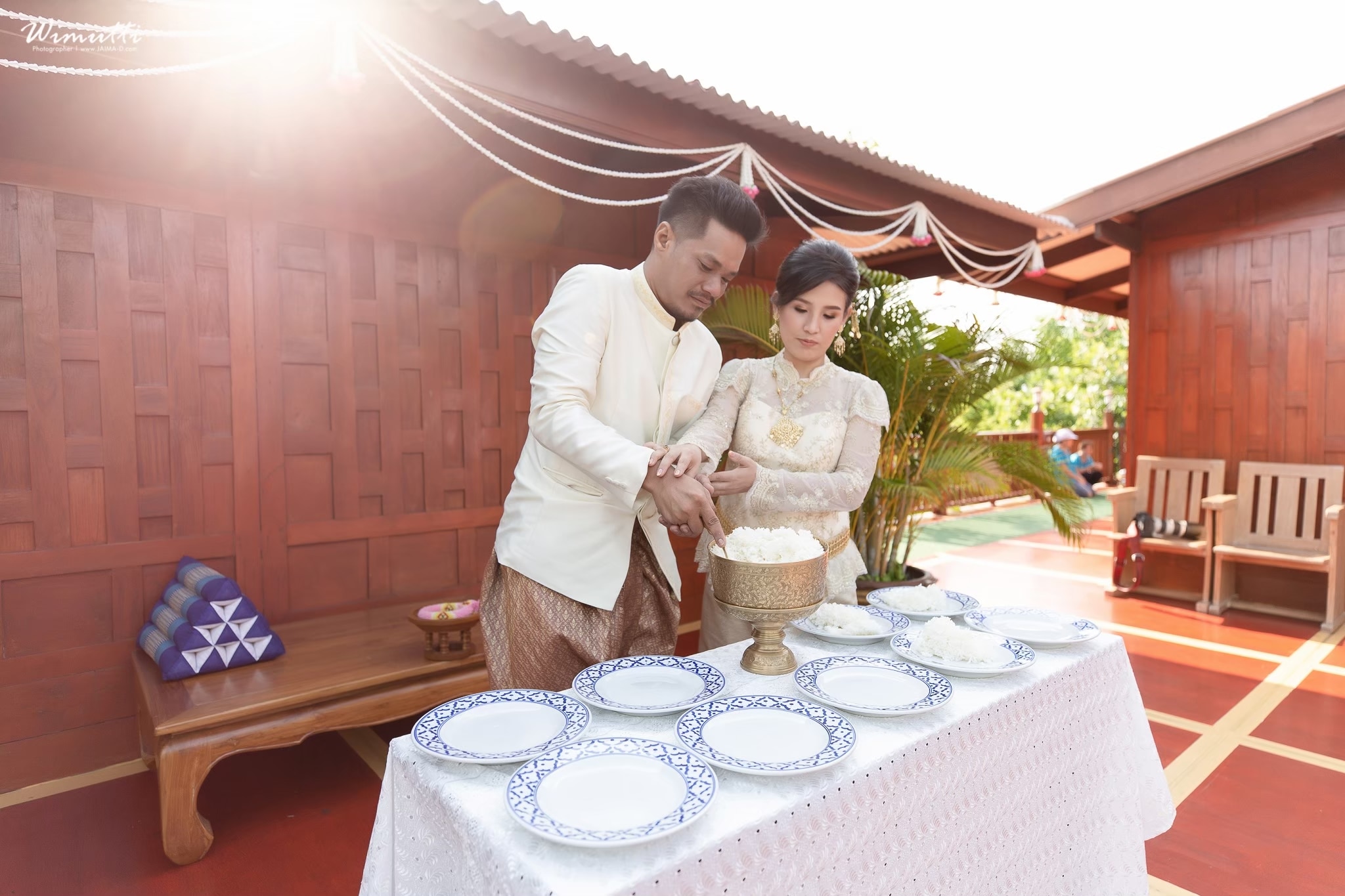 พิธีรดน้ำสังข์ ผูกข้อไม้ข้อมือ งานพิธี งานเลี้ยงเย็น ถ่ายรูปร่วมยินดีหน้าแบล็กดรอป