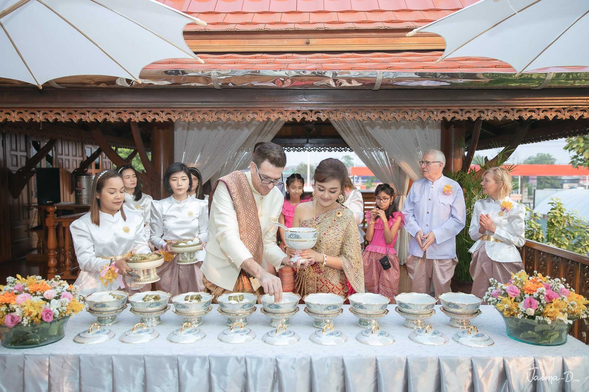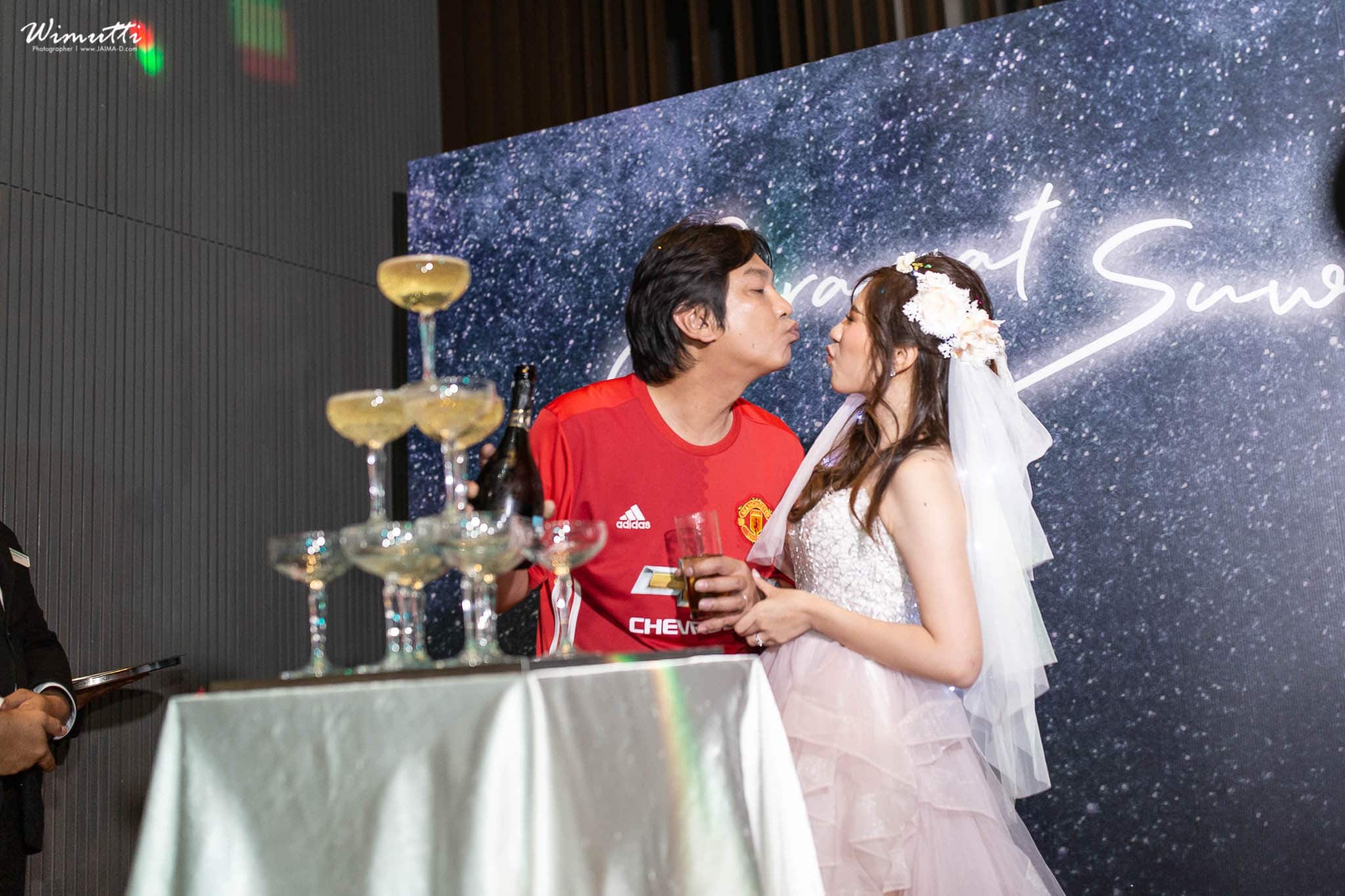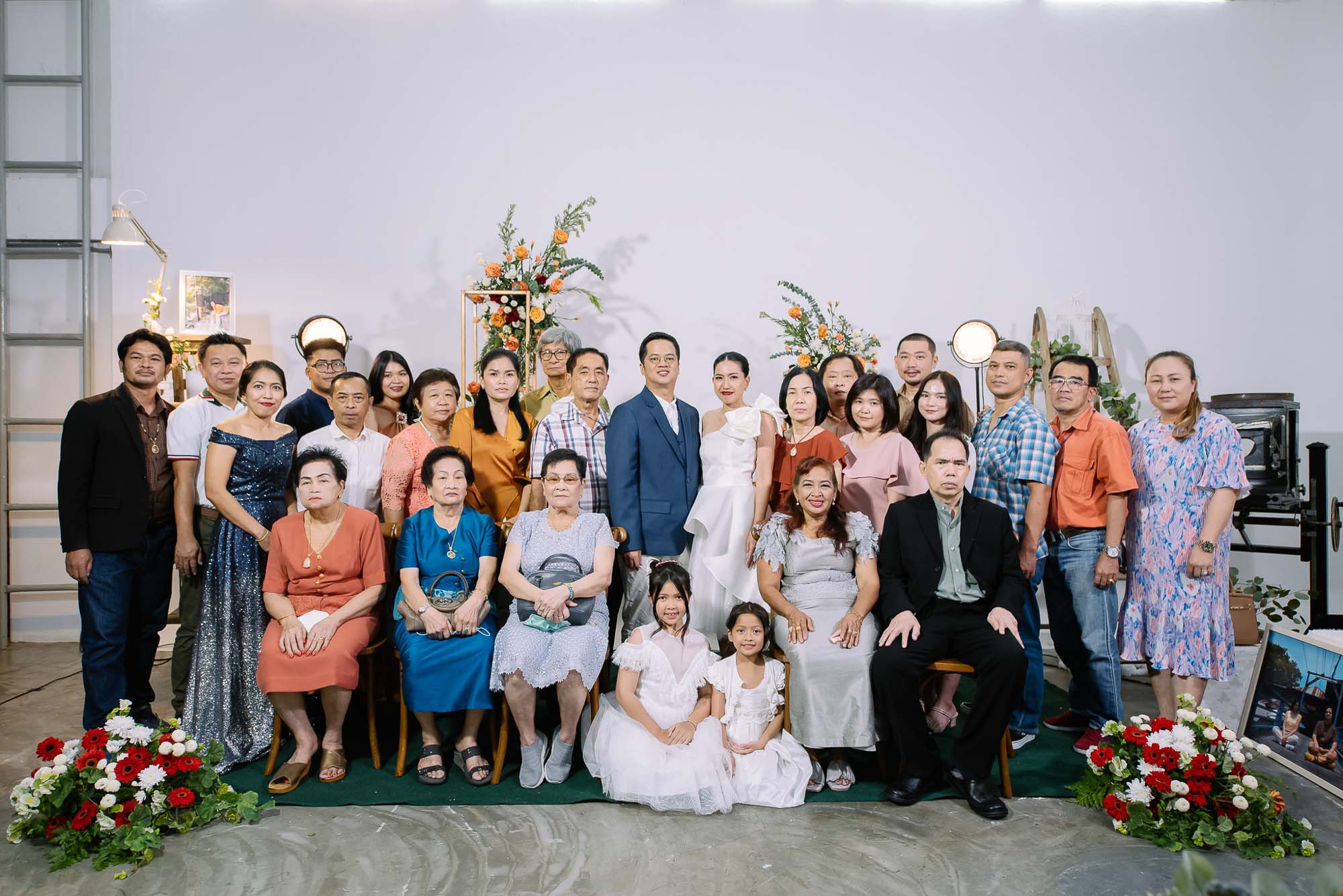 พิธีรดน้ำสังข์ ผูกข้อไม้ข้อมือ งานพิธี งานเลี้ยงเย็น ถ่ายรูปร่วมยินดีหน้าแบล็กดรอป